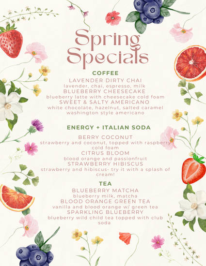 Our Spring Specials Menu is here and ready to make your mouth water with fresh flavors like Lavender Dirty Chai, Blueberry Cheesecake Latte, Citrus Bloom, and Strawberry Hibiscus.